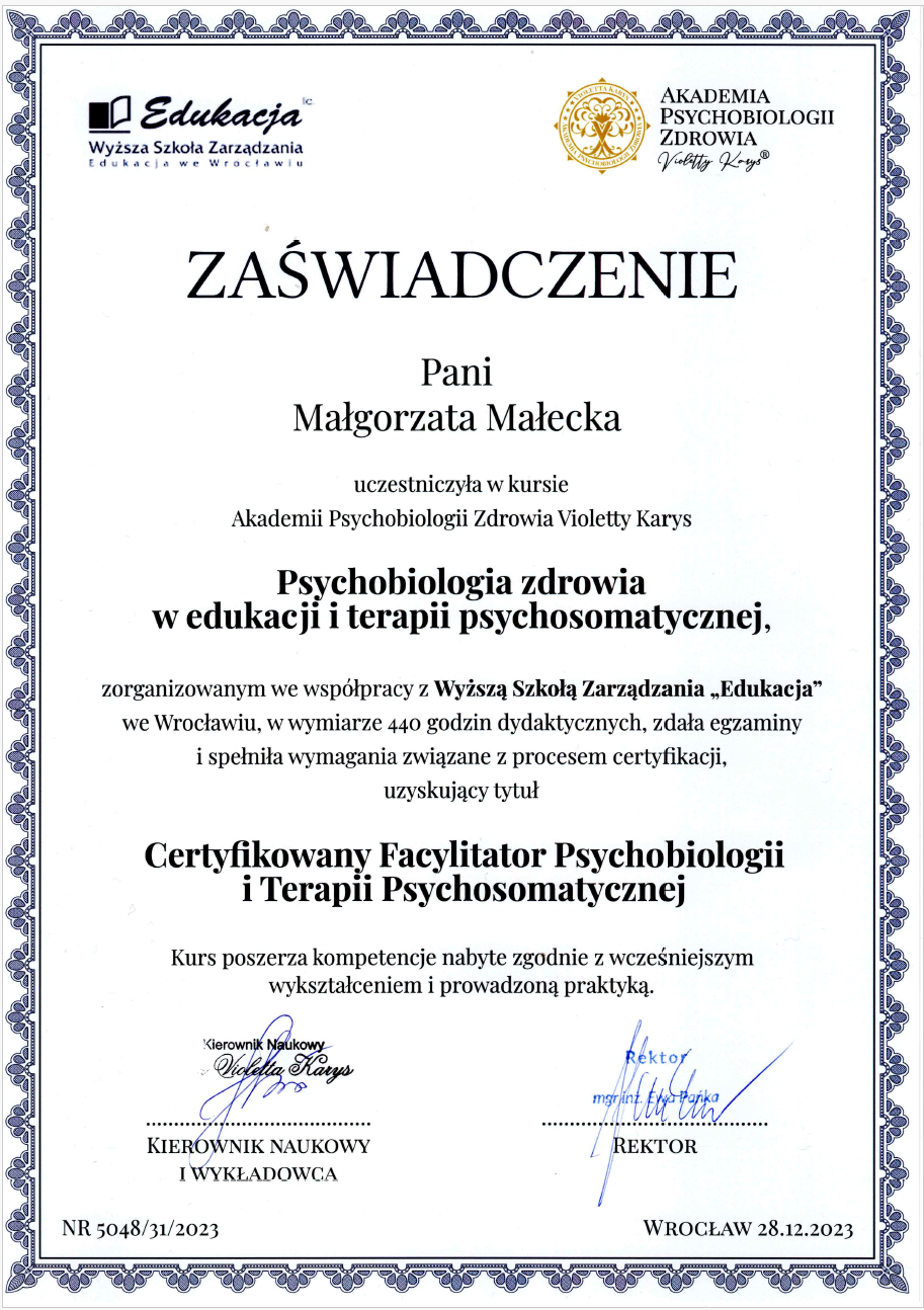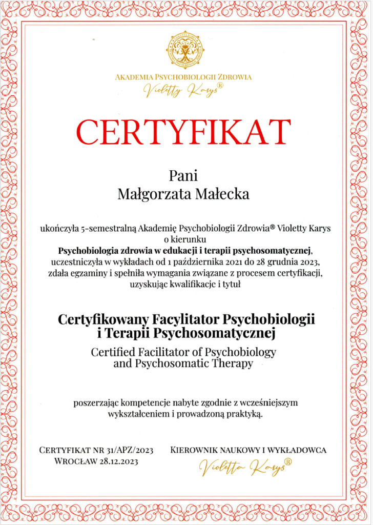 - 2021–2023 – ukończyłam 22 modułową (440h) Akademię Psychobiologii Zdrowia® Violetty Karys utrwalając i poszerzając zdobytą wiedzę.