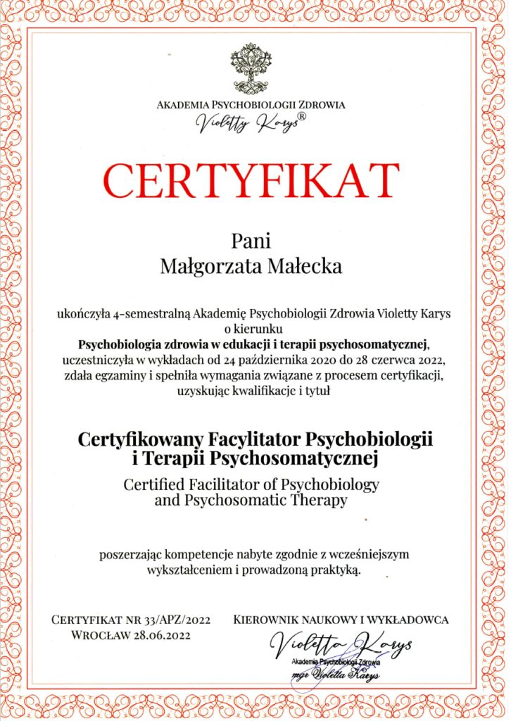 - 2020–2022 – ukończyłam 15-modułową (300h) Akademię Psychobiologii Zdrowia® Violetty Karys