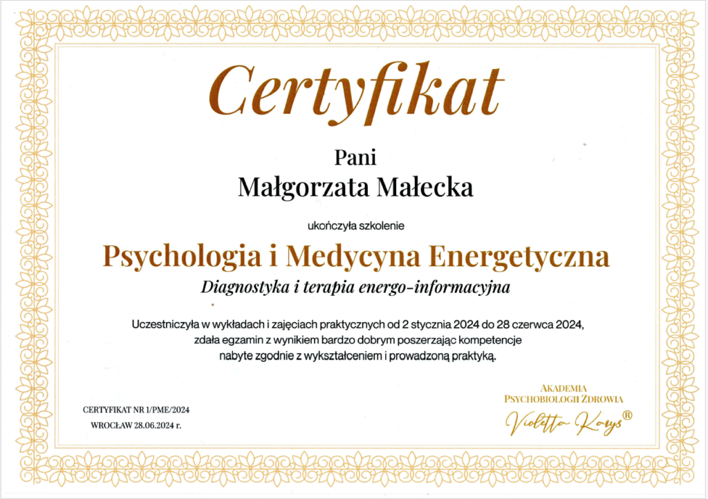 - 2023/2024 – ukończyłam półroczne szkolenie „Psychologia i Medycyna Energetyczna” (84h).