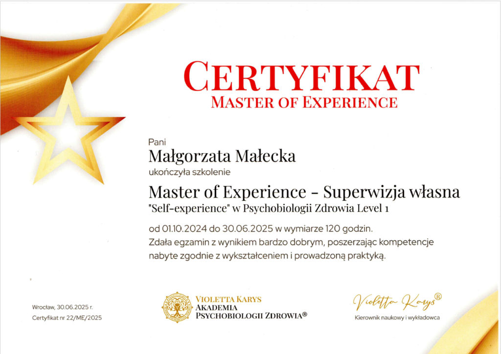 - 2025/2026 kontynuuję rozwój i praktykę w ramach programu superwizji „Master of Experience – Level 2”.